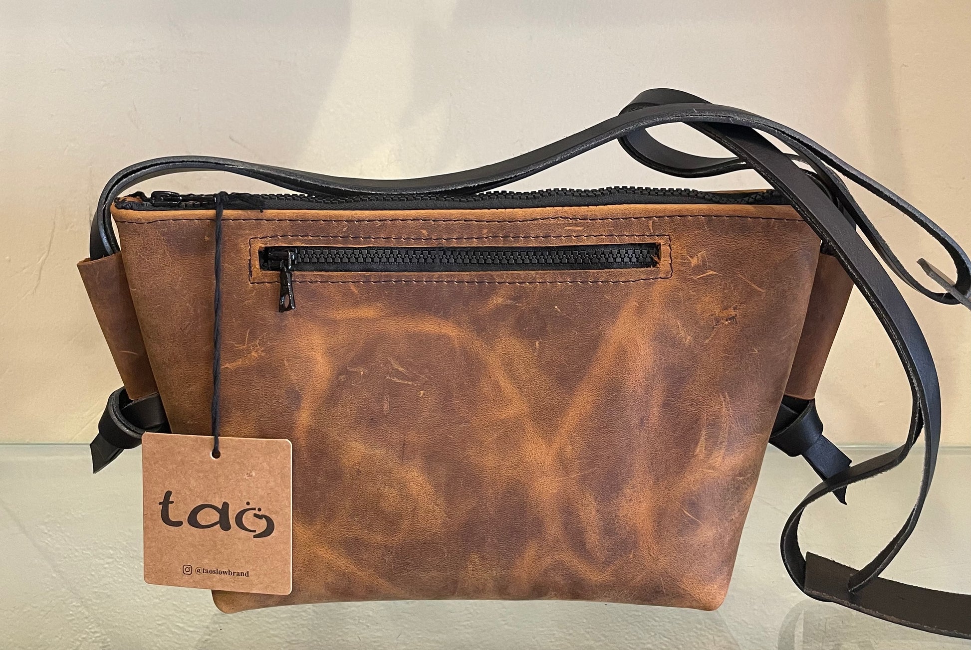 Minibag Brown greased calfskin leather Pull-Up, slit cut, adjustable leather shoulder straps and outside zippered pocket.